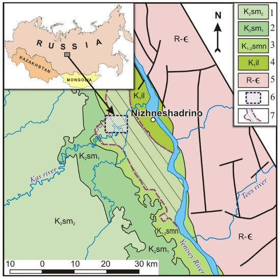Geological map showing the location of the Nizhne-Kas germaniferous lignite area [38]. Note: 1—Upper Cretaceous system, Campanian–Maastrichian stages, Symskaya Formation, upper subformation, Vari-grained quartz sand kaolinized with interlayers of kaolin clay and lignite; 2—Upper Cretaceous system, Cognac–Santonian stages.; Symskaya Formation, lower subformation., Vari-grained quartz sand with interlayers of kaolin clay; 3—Lower-Upper Cretaceous system, Albian-Cenomanian-Turonian stages, Simonovskaya Formation, Lake-alluvial deposits, Quartz sand with interlayers of clay and poorly lithified sandstone, germaniferous lignite; 4—Lower Cretaceous system, Valanginian–Barremian stages, Ilek Formation, Variegated clay and clayey sand with interlayers of siltstone, mudstone, sandstone, and inclusions of plant residue; 5—Riphean-Cambrian crystalline basement., Metasedimentary rock including granitoid, gabbroid, and ultrabasic bodies metamorphosed to amphibolite and greenschist facies; 6—The Serchanskoe Ge deposit; 7—Outlines of the Nizhne-Kas lignite deposit.