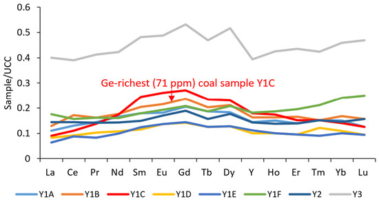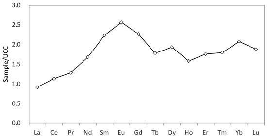 The hydrogenic accumulation model is supported by the character of the normalized graphs of REE (Figure 8). The M-H type of REE distribution is specific for the hydrogenic nature of lanthanide accumulation in coals [21]. The connection of lanthanide anomalies with the hypergene water is also confirmed by the presence of a weakly manifested cerium anomaly in the coal. This anomaly indicates the connection of aqueous solutions with the formation of the weathering crust.