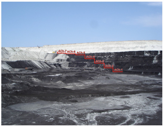 The deposit has a single thick coal seam lying in the coal-bearing strata of the upper sub-formation of the Dzunbainskaya Formation. The coal-bearing formation is represented by alternating dark gray and gray argillite, sand, and loosely cemented sandstone. A significant part of the formation is occupied by coal. Within the mined area, there is one seam up to 40-m thick, 34-m thick on average (Figure 7). In other areas, there are 2–3 seams from 1 to 10-m thick. The coal in the deposit is of the sub-bituminous C type. The average ash yield (Ad) is 16.7%, yield of volatiles is 48.1%, total sulfur (TS) is from 0.68 to 2.0% (1.1% on average), and the vitrinite reflectance (Rmax) is 0.32% [66].