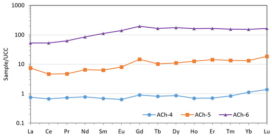 REE distribution patterns of weakly oxidized coal (ACh-4), oxidized coal (ACh-5), and sooty coal at the contact with the roof conglomerates (ACh-6); normalized for UCC according to Taylor and McLennan [71].