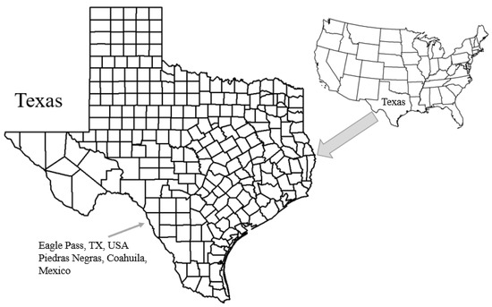 Location of Eagle Pass, Maverick Co., Texas, USA, and Peidras Negras, Coahuila, Mexico.