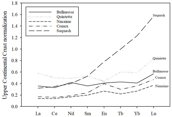 Data for the western U.S. coals are presented in Tables S3 and S4. As analytical caveats, for the U.S. Geological Survey samples [85] (Table S3), only the W- and WA-prefix analyses were used in the discussion. Data reliability issues, including missing and some falsified analyses precluded the use of D-prefix analyses from that database. For the Penn State samples, the analytical methods employed at the time of the analyses (Direct Current (DC) Arc Emission Spectrography (installed in 1951; Harold Lovell personal communication to Hower, 1976) were not as precise as the methods employed at the time of this writing; details of the technique are in Grimes and Marranzino [86], so the REE, aside from La and Ce, were not detected.