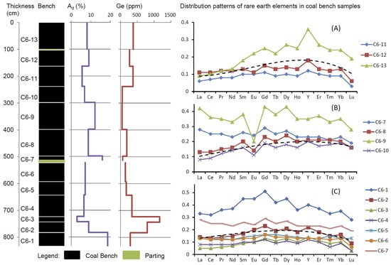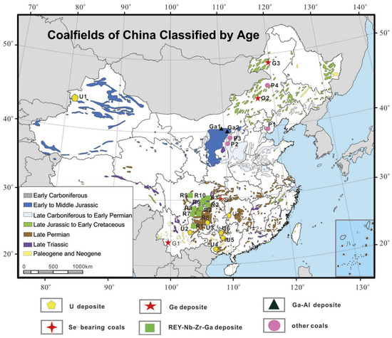 Critical elements in coal and coal-bearing sequences, such as Li, Sc, V, Ga, Ge, Se, and Y and rare earth elements (REY, or REE+Y) Zr, Nb, Au, and Ag, and platinum group elements, Re, and U, have attracted great attention in recent years [1,2,3,4,5,6,7,8], as these elements in some coals and coal-bearing sequences may have relatively high concentrations, comparable to those of conventional ore deposits [9,10]. Nowadays, world economies largely depend on high technologies in which critical elements play a vital role because they are driving some of the biggest advancements in technology and energy efficiency in the world [3,11]. The demand for these critical elements has grown rapidly due to their wide applications, but there are potential supply-related risks because (1) the resources of conventional ores of these elements are becoming smaller and even exhausted; and (2) supplies of these critical elements are controlled by a limited number of countries/areas; for example, as of 2019, China produced ~85% of the world’s rare earth oxides and ~90% of rare earth metals, alloys, and permanent magnets (https://chinapower.csis.org/china-rare-earths/, accessed on 6 September 2022). These reasons have prompted global exploration for new sources of these critical elements. One promising source of many of these critical elements is coal and coal-bearing sequences [3,9,10,11,12,13,14,15,16,17,18,19,20].