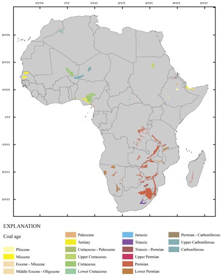 - Merrill, M.D.; Tewalt, S.J. GIS representation of coal-bearing areas in Africa: U.S. Geological Survey Open-File Report 2008-1258. 2008. Available online: https://pubs.usgs.gov/of/2008/1258/ (accessed on 6 September 2022).