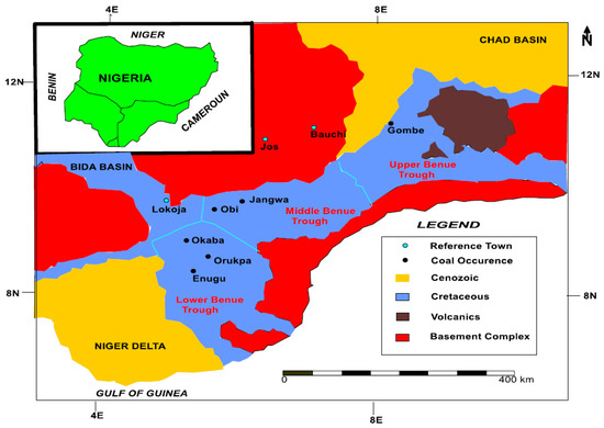 - Obaje, N.G.; Umar, U.M.; Aweda, A.K.; Ozoji, T.M. Nigerian Cretaceous coal deposits and their petroleum source rock. Int. J. Pet. Gas Explor. Manag. 2020, 4, 1–14. [Google Scholar]