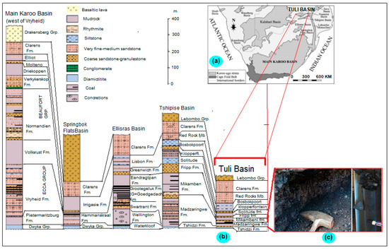 - Bordy, E.M.; Catuneanu, O. Sedimentology of the Beaufort-Molteno Karoo fluvial strata in the Tuli Basin, South Africa. S. Afr. J. Geol. 2002, 105, 51–66. [Google Scholar]