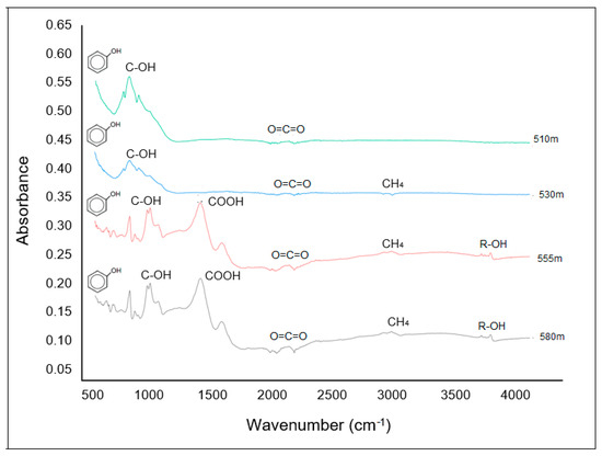 Due to C–H stretching vibrations, hydrocarbons show infrared absorption peaks between 2800 and 3300 cm−1. The sp2 C–H hybridisation found with an absorption peak between 3000–3100 cm−1 wavelength indicates the gaseous hydrocarbon. Some studies [64,65] reported the gaseous hydrocarbon of CH4 has infrared absorbance peaks between 2850 and 3000 cm−1 due to aliphatic C–H stretching of methyl and methylene vibration, while the low absorption peak around 3500 cm−1 corresponds to water desorption wavelength [66]. In aromatic hydrocarbon, the carbon chain voids act as trapping and binding sites for organic lipids and inorganic materials such as hydrous oxides and clay minerals [67]. At greater burial depths around 510 and 580 m, the spectra showed inconspicuous peaks of the carboxylic group suggesting the maturation of organic matter beyond the methanogenesis window to coalification.