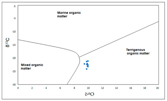 The carbon and oxygen isotopic compositions of organic materials associated with the carbonaceous shale samples of the Tuli Basin are presented in Table 3. The carbon isotopic composition, δ13C, of the organic-rich shales of the Madzaringwe Formation, ranged from values −21.01 to −24.0‰, averaging at −22.4‰. It implies that most carbon isotopic signatures of studied samples reflect provenance from terrigenous plant material since it exceeds the −22‰ value, as shown in Figure 4. Meanwhile, the carbon isotopic composition found with −20‰ values indicates some influx of organic materials from marine settings [31].
