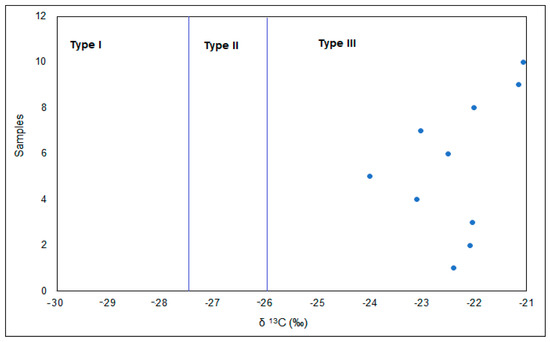 Meanwhile, isotopic composition, δ18O, tends to increase downward from 485 m to 580 m with intermittent anomalous depleted values. The increasing δ18O values are attributed to a significant influx of meteoric water, while the anomalously depleted oxygen values show a decrease in pore-water δ18O values during diagenesis of mineral–water interactions in a closed chemical microsystem of shale [36]. The negative correlation of δ18O relate with degradation of organic matter content reflected in loss of ignition. The loss of ignition suggests combustion of the carbon content of land-derived organic matter, which is rich in vascular plant materials. Such inference is consistent with the carbon isotopic compositions of the studied Madzaringwe shales, which show Type-III kerogen [35,37] in Figure 6. This interpretation agrees with the terrigenous source depicted by the plot of δ18O vs δ13C values. In contrast, the observed carbon isotopic composition of alum shale in southern Scandinavia is typical of marine sources varying from −30 to −27‰, which mainly belong to the Type-I kerogen domain [31].