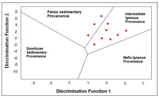 Plot of Discrimination functions using major elements index for felsic and mafic provenance and quartzose sedimentary provenance (Note: Discrimination Function 1: −1.733 TiO2 + 0.607 Al2O3 + 0.76 Fe2O3 (t) −1.5 MgO + 0.616 CaO + 0.509 Na2O − 1.224 K2O − 0.909. Discrimination Function 2: 0.445 TiO2 + 0.07 Al2O3 − 0.25 Fe2O3 (t) − 1.142 MgO + 0.438 CaO + 1.475 Na2O + 1.426 K2O − 6.861) [38].