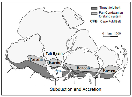 The Madzaringwe shale of the Tuli Basin is geographically positioned in the southern Gondwana supercontinent having similar age as the Irati Formation in Parana Basin, Brazil [72,73], Bowen Formation in Australia [74,75], and Whitehill Formation in the main Karoo group, South Africa [76,77,78] during the Permian period (Figure 9). Recently, the age of the shale gas-bearing Irati Formation has been constrained using U-Pb zircon, indicating 275.75 ± 0.29 Ma corresponding to the Permian period [79]. The rapid evolutionary changes in land plants of Gondwana are attributable to the dramatic climatic change after the deglaciation of the Carboniferous Tshidzi fluvioglacial of the Tuli Basin [15], Dywka group of Karoo group [80,81], and Itararé sub-group of Paraná Basin [82,83]. On the other hand, the Tuli Basin differs from the mentioned southern Gondwana Basin based on non-marine sedimentation. The preservation of carbonaceous shale and coal seams is associated with a humid climate under autochthonous reducing conditions and deposited by fluvial activity in the depozones. The lithologies of the Tuli and the Gondwana Basins generally consist of diamictite with a clast ranging up to 2 m in diameter embedded in an argillaceous and sandy matrix [15,75,82] underlying the shale gas-bearing formations.