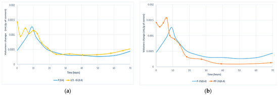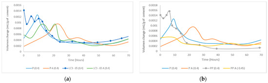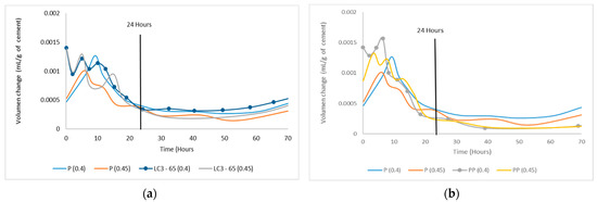 Figure 3b shows the curves of the first derivative of the volume variation versus time variation for the series with PPC. There is also a delay in the expansion peak with the addition of SP. After 24 h, it can be seen that the volume of the PPC cement samples with additive does not vary, while the Portland cement sample has a greater volume variation between 30 and 40 h. This is probably caused by the retarding effect of the SikaPlast admixture.