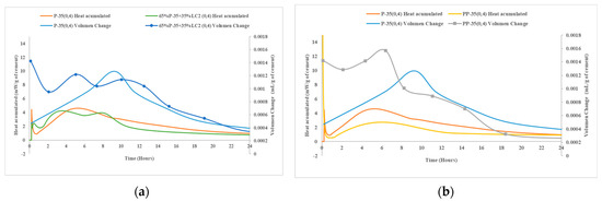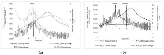 Figure 4a,b presents a correlation between volume change and heat of hydration. It can help explain the expansion peaks and the shrinkage with time. There is a good match between the volume changes measured in cement pastes and the heat of hydration for all series.
