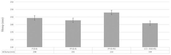 The presence of pozzolanic materials with high specific surface implies an increase in water demand. In this study, water demand was assessed by measuring the slump in concrete [46,47]. SP was added until reaching the target consistency for concrete (fluid). Figure 5 presents the slump of concrete produced.