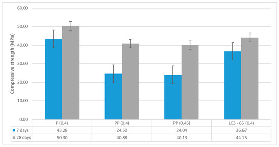 Figure 6 presents the results for compressive strength in concrete made with OPC, PPC and OPC + LC2. The strength of concrete made with blended cements is slightly lower than that of concrete made with OPC. Despite the higher water–cement ratio, the combination of OPC and LC2 yields higher strength compared to PPC. The strength evolution is strongly related to the amount of clinker in the system. Cements with calcined clay are less sensitive to changes in water–cement ratio.