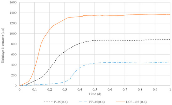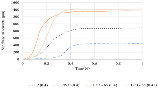 Figure 7 shows the volume changes at early ages of concrete with different binders. The highest values of expansion are reached with LC3-65, most likely associated with the enhancement of the hydration of the clinker products produced by the lower clinker rate and the high specific surface of calcined clays, which creates extra spaces for heterogenous nucleation [45].