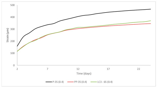 The changes in volume after setting, called the autogenous shrinkage process, is relevant in high-strength concrete with low water–cement ratios and consists of shrinkage due to the loss of water from the capillary pores due to cement hydration (diffusion stage) [36]. On the contrary, in high-strength concrete, autogenous drying acts rapidly to increase capillary pressures and, therefore, compress the solids, which increases the probability of early age cracks in the concrete. Therefore, it is important to analyze the relationship between strengths and deformations over time [4,38,49].