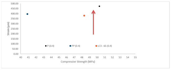 Figure 11 presents the values of compressive strength versus the strain from T = 0 to T = 28 days in all concrete series. The series with OPC has a much larger strain compared to PPC and 65%OPC + 35%LC2 concrete. The best results are obtained with the combination of OPC + LC2, where high strength values and lower strain are experienced. This result is mainly due to the use of mineral additions such as calcined clays (LC2), which favor an increase in compressive strength and contribute to mitigating deformations over time. Further, the impermeability of the matrix can mitigate the occurrence of drying shrinkage in concrete made with OPC + LC2.