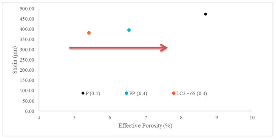 Figure 12 shows the relationship between the effective porosity of the concretes with the deformation they undergo in 28 days, where it is observed that concretes with mineral additions have a lower porosity. The effective porosity is represented as the interconnected pores in the concrete mass, which, depending on the type of cement, has an effect on durability. The best combination is the concrete series with OPC + LC2, with the lowest porosity for a similar strength. This concrete is less prone to cracking in comparison with the other two.