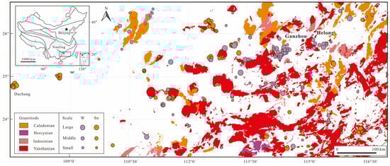 Distribution map of granitoids and major Mesozoic W–Sn deposits in Nanling region (modified from []).
