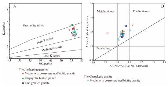 Pl SiO2 vs. K2O diagram (A) and A/NK vs. A/CNK diagrams (B) of the Helong granities (the compositional fields are from Rollinson [] and Streckeisen and Le Maitre [], respectively).