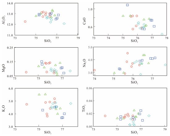 The Jinzhuping main-phase granite has the strongest depletions in Eu, P, Ti, and Sr in the four granites (Figure 6). The average Sr contents of Changkeng and Jinzuping granites (from the main-phase, porphyritic to aplite) increase from 11.1 to 11.2 to 15.9 to 17.5 μg/g. The average Ba contents of the four granites are 19.6, 10.1, 30.8, and 18.0 μg/g, respectively. The K/Rb ratio can reflect the degree of magma differentiation evolution, and a low K/Rb ratio is usually one of the important characteristics of highly evolved magmatic systems [,,]. The K/Rb ratios of the Helong ore-hosting granites are all low, with average values of 84.15, 63.43, 60.76, and 64.84, respectively. The Zr/Hf ratio of rocks indicates the evolution degree of magmatic system and whether fluid metasomatism has occurred. The Zr/Hf ratio of granites decreases with increasing degree of evolution or fluid metasomatism [,]. The average Zr/Hf ratios of the four granites are 13.14, 12.02, 15.05, and 11.28, respectively, which are significantly lower than those of ordinary granites (39) []. This result indicates that the Helong granites have undergone large-scale fluid metasomatism, in a similar way to what happened with granites from the granites in Southern Jiangxi Province []. On the basis of above evidences, the Helong granites experienced a high degree of differentiation and evolution, while the degree of the main-phase Jinzhuping granite is much higher than other granites.