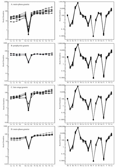 Chondrite-normalized REE patterns and element diagrams for the Jinzhuping granites (A–C), and the Changkeng granite (D). Normalization values are from Sun and McDonough [].