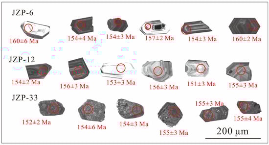 Most of the zircon crystals selected from samples of JZP-6, JZP-12, and JZP-33 are short columnar, euhedral to subhedral, 60–180 μm long, and yield length/width ratios from 1:1 to 4:1. Most zircons are euhedral to subhedral, have well-developed oscillatory cathodoluminescence (CL) zoning (Figure 7), and are colorless to dark (most of samples JZP-6 and JZP-12) to dark and opaque (most of sample JZP-33). The age for each sample is given as the error-weighted mean of the common Pb-corrected 206Pb/ 238Pb ages of the selected grains at the 95% confidence level. The LA-ICP-MS U–Pb zircon geochronology results for two dated samples are presented in Table 2, and U–Pb concordia diagrams are given in Figure 8.