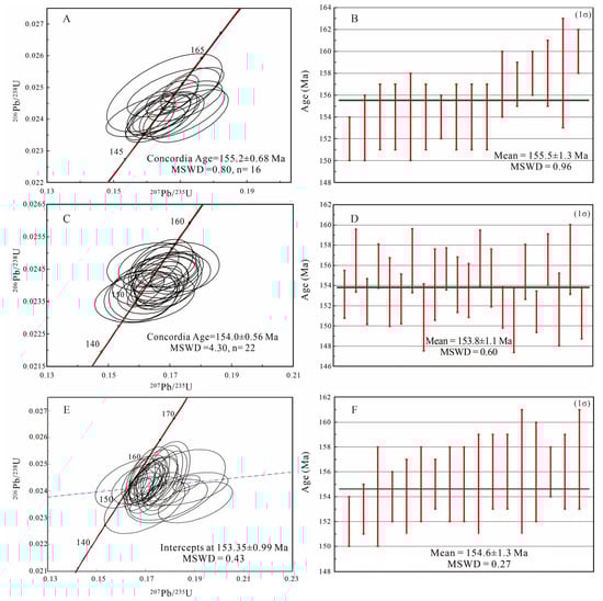 Twenty-two zircon grains from sample JZP-6 were examined, and their U and Th concentrations varied from 118.2 to 20583.2 ppm (mean 3985.5 ppm) and from 66.5 to 1801.3 ppm (736.3 ppm), respectively, and the U/Th ratios varied from 1.1 to 10.8 (Table 2). These characteristics indicate a magmatic origin for the zircon grains. Sixteen spots of the zircon grains (from JZP-6-6 to JZP-6-22) were used, because the other six analyses yielded very high-U contents that would result in inaccurate U–Pb age calibrations []. These analyses yielded a concordant age of 155.2 ± 0.68 Ma (MSWD = 0.8) (Figure 8A), which coincided well with the weighted mean 206Pb/238U age of 155.5 ± 1.3 Ma (MSWD = 0.96) (Figure 8B). This age represents the crystallization age of the main-phase biotite granite.