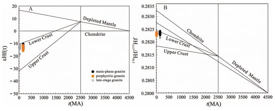 The zircon Hf isotope determination points were the same sites as the zircon U–Pb measurements. The data from the fifty measured spots of the Jinzhuping granite samples are shown in Table 3 and plotted on Figure 9. The Hf isotopic analyses for 15 zircon grains from the main-phase biotite granite (sample JZP-6), with initial 176Hf/177Hf ratios varying from 0.282292 to 0.282406, yield εHf(t) values from −14.2 to −10.4. The Hf isotopic analyses for 18 zircon grains from the porphyritic biotite granite (sample JZP-12), with initial 176Hf/177Hf ratios varying from 0.282257 to 0.282370, yield εHf(t) values from −15.3 to −11.4. There are 17 spots for the aplite (Sample JZP-33), providing initial 176Hf/177Hf ratios of 0.282190−0.282410, corresponding to an εHf(t) from −18.1 to −10.5. Their two-stage Hf model ages (TDM2) range from 1.83 to 2.06 Ga, from 1.89 to 2.14 Ga, and from 1.83 to 2.31 Ga, respectively.