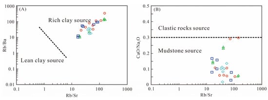 According to the studies of Sylvester [], peraluminous granite formed by partial melting of source materials with different compositions will result in different CaO/Na2O ratios. The CaO/Na2O ratio of granites formed from mudstone (<0.3) is lower than that of granites formed from clastic rocks. In the Rb/Sr-Rb/Ba diagram (Figure 10A), the Helong granites in southern Jiangxi Province mainly fall into the clay-rich source area, and in the Rb/Sr-CaO/Na2O diagram (Figure 10B), they fall into the argillite source region. Su et al. [] suggested that the granitoids related to W–Sn deposits in the southern Jiangxi Province mainly formed from argillaceous rock rich in clay. This conclusion also supports the interpretation that the Helong granites were derived from the fertile crustal source.