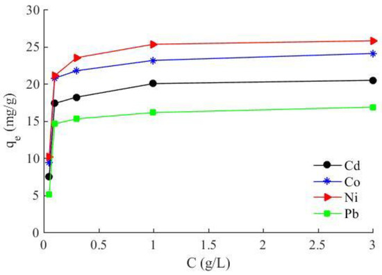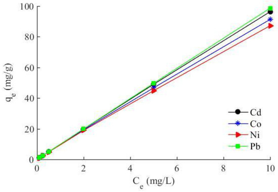- Isotherm experiments were carried out at different initial concentrations (0.1–10 mg/L) of lead, nickel, cobalt and cadmium ions and shaking in 100 mL of the sample solution for an equilibrium time and at a constant temperature of 298 K. In order to prepare solutions with lower and higher concentrations than the main wastewater sample, certain weighed amounts of Pb(NO3)2, NiCl2, Co(NO3)2 and Cd(SO4) were added to the solutions. The equilibrium solution concentration was measured, and the quantities of metals adsorbed per unit weight of biosorbent were calculated by the equilibrium equations. In addition, the biosorbent distributions between the solid and liquid phases were assessed by different isotherm models including Langmuir, Freundlich and Dubinin-Radushkevich isotherm models.