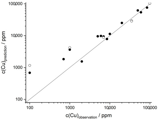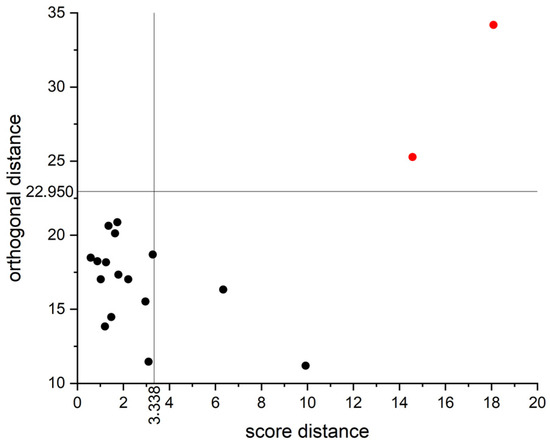 The black dots are the result of the PLS calibration (R2CV > 0.97), while the circles represent the validation of the model (R2V > 0.95). Although the validation has a fairly high goodness of fit, the plot shows potential outliers that could negatively affect the correlation. To identify these potential outliers, the robust principal components analysis (ROBPCA) method of Hubert et al. is applied [28]. As a result, an outlier map (Figure 4) is obtained, which is plotted between score distance and orthogonal distance.