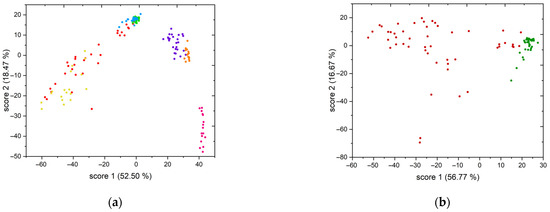 Figure 7. (a) Score plot of PCA of all samples analyzed with LIBS on the handheld spectrometer (red—Cypriot mine 1, yellow—Cypriot mine 2, green—Cu2S in basalt, blue—CuFeS2 in basalt, purple—Polish mine, orange—Cu2S in schist, pink—CuFeS2 in schist). (b) Score plot of PCA of Cyprian samples (dark red) and samples containing Cu2S and CuFeS2 in basalt (dark green).