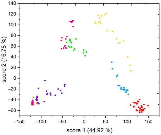 Figure 8. Score plot of PCA of all samples analyzed by LIBS on Echelle spectrometer (red—Cypriot mine 1, yellow—Cypriot mine 2, green—Cu2S in basalt, blue—CuFeS2 in basalt, purple—Polish mine, orange—Cu2S in schist, pink—CuFeS2 in schist).