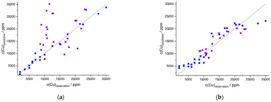 Figure 9. (a) PLSR (4 components) of the synthetic samples (Cu2S and CuFeS2 in schist; dark blue) applied to the Polish field samples (purple): R2V = −1.95, RMSEV = 8228 ppm; (b) PLSR (4 components) of the synthetic samples (Cu2S and CuFeS2 in schist) and 22% of the field samples (dark blue) applied to the Polish field samples (purple): R2V = 0.79, RMSEV= 2180 ppm; all measured on Echelle spectrometer.