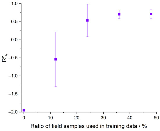 Figure 10. Evolution of the R2V of the validation data with increasing proportion of randomly chosen field samples in the training data for the Polish samples measured on the Echelle (purple). This process was performed five times.