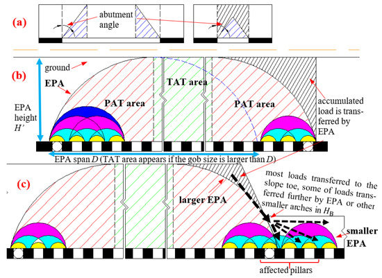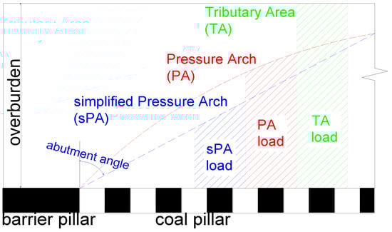 29]. When a continuous void space is created by longwall mining, the line determined by the abutment angle can actually be treated as a simplified pressure arch (i.e., the blue area in