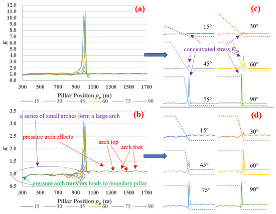 Figure 12a), and the overburden load in the range of the abutment angle is transferred to the boundary pillars [