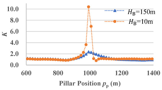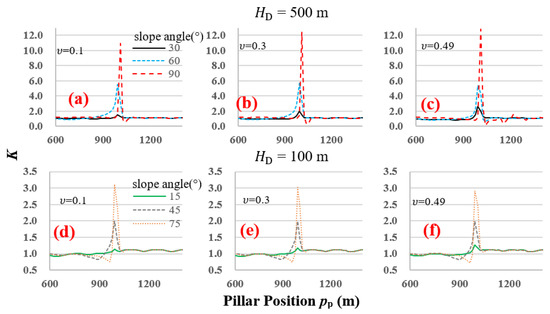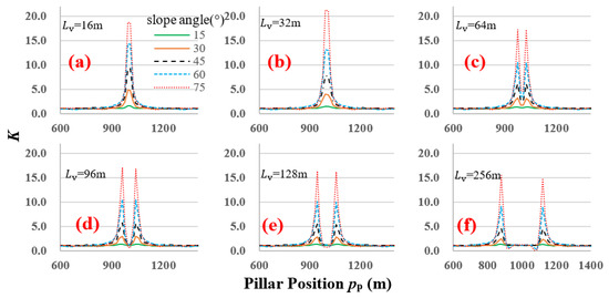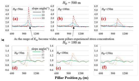 Figure 12c) cannot be transferred to the boundary (in contrast to a horizontal ground), most of the load is applied to the pillar near the slope toe and only limited load is continuously transferred away. Therefore, the stress concentration depends on the intensity of the EPA distribution instead of a single factor such as slope angle, slope height, etc.