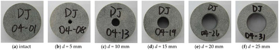 Testing was conducted on rock samples taken from the Ding-ji Coal Mine, Huainan City, Anhui Province. According to the international rock mechanics test code and the Chinese rock dynamics test code [35,36], the rock samples were cored, cut, and polished into standard cylindrical specimens with a diameter of D = 50 mm and H = 25 mm. Drill bits d = 5, 10, 15, 20, and 25 mm with different outer diameters were used to drill sandstone specimens. The processed ring sandstone specimen is shown in Figure 1.
