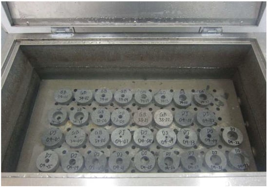 The prepared ring sandstone specimen was put into a constant temperature water bath and soaked for 48 h so that the specimen reached the saturated state. In the study of Ping et al. [37], 45 °C is an inflection point at which the dynamic properties of specimens change. Therefore, 45 °C was adopted as the coupling saturation condition of warm water in this experiment. The thermostatic water bath used in the test is shown in Figure 2.
