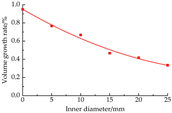 The volume growth rate of ring sandstone specimens decreases with the increase in inner diameter. The fitting results show a quadratic function where the inner diameter of the ring specimen is with the volume growth rate, and the correlation coefficient reaches 0.9808. The fitting formula is shown in (2).
