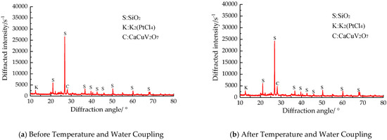 As can be found in Figure 6, no new substances were found before and after the temperature and water coupling. The composition of ring sandstone specimens remains basically unchanged before and after temperature and water coupling, and quartz (SiO2) is one of the most important components of sandstone specimens.