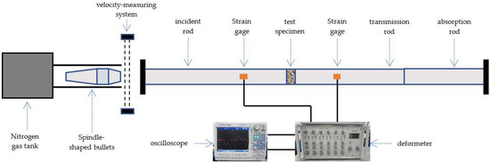 By using the Hopkinson pressure bar (SHPB) test facility, dynamic compression mechanical properties of ring sandstone specimens with different inner diameters were studied could be tested. This test equipment was the SHPB test facility of the State Key Laboratory of Mining and Response in the Deep Coal Mine. The pressing rod of the equipment is made of high-strength alloy steel, with a diameter = 50 mm, length of the incident rod = 2 m, length of the transmission rod = 1.5 m, wave velocity of the press rod = 5380 m/s, density = 7636 kg/m3, Poisson’s ratio = 0.28. The test equipment is shown in Figure 7.