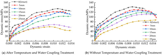 The slope of the dynamic stress-strain curve of sandstone specimens with and without temperature and water coupling ring is gradually gentle with the increase in inner diameter, which is shown in Figure 9. The intact sandstone specimen has the biggest dynamic compressive strength and the lowest dynamic peak strain. The dynamic compressive strength of the ring sandstone specimen is smaller, and the dynamic peak strain is larger after temperature and water coupling.