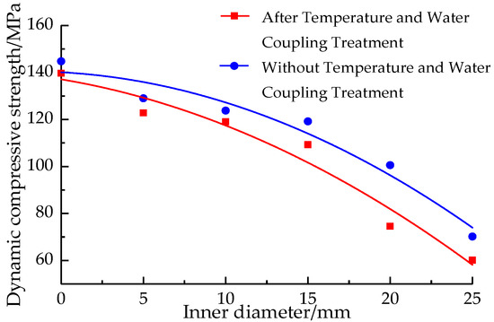 The dynamic compressive strength after temperature and water coupling are lower than that without temperature and water coupling. The dynamic compressive strength of specimens with and without temperature and water coupling reaches the maximum value in the intact state. After temperature and water, the maximum dynamic compressive strength of the ring sandstone specimen coupling is 139.71 MPa, and the maximum dynamic compressive strength of the ring sandstone specimen without temperature and water coupling is 144.78 MPa. It shows a quadratic function relationship that decreases with the increase in inner diameter, and the negative correlation is obvious. The fitting formula is shown in (5). The correlation coefficients reached 0.9406 and 0.9303, respectively, showing a strong correlation.