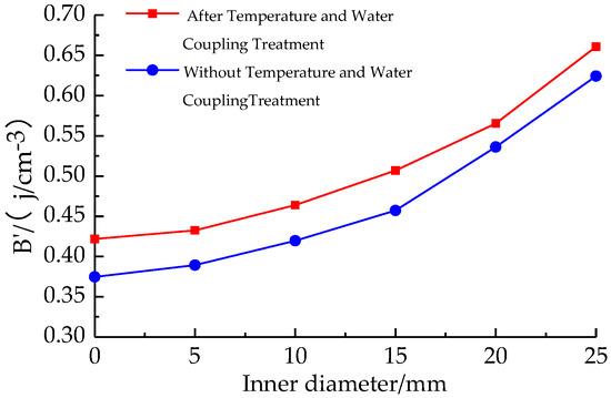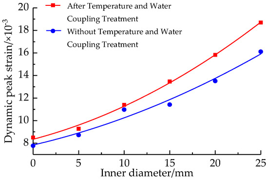 The specimen’s dynamic peak strain which treated with temperature and water coupling, is greater than without treatment. The dynamic peak strain of both specimens reached its maximum value at the inner diameter of 25 mm, which were 18.55 × 10−3 and 16.93 × 10−3, respectively. The fitting analysis was carried out, and the correlation coefficient reached 0.9965 and 0.9696. The fitting formula was obtained as shown in (6)