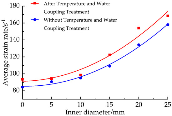 The average strain rate of ring sandstone specimens treated with and without temperature and water coupling showed an increasing trend with the increase in inner diameter. The fitting formula is shown in (7). The correlation coefficients reached 0.9478 and 0.9912. The average strain rate reaches its maximum value at the inner diameter of 25 mm. The average strain rate of ring sandstone specimen under temperature and water coupling is 168.45 s−1, and that without temperature and water is 158.05 s−1.