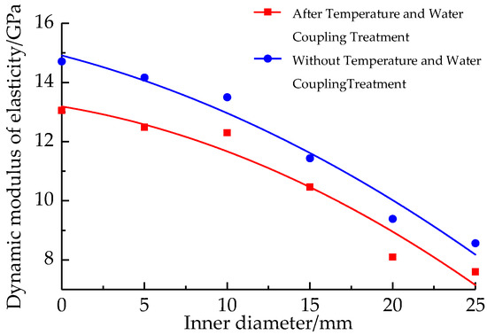 The analysis shows that the wall thickness of the specimen decreases with the increase in the inner diameter, which makes it more prone to instability failure. The dynamic elastic modulus is reduced. The specimen shows the characteristic of decreasing elastic modulus after the coupling action of temperature and water. Because the coupling action causes deterioration damage in the sandstone specimen